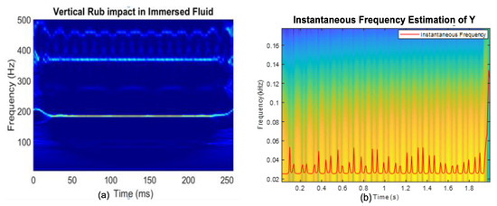 No fluid-NWSST representation of the imbalanced drill string signal in the Y direction. (a) Extracted feature from NWSST; (b) Extracted impulse feature from NWSST immersed in fluid.