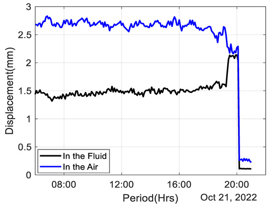 For the experiment presented, the drill string rotates in the air, and for the fluid, at a speed of approximately 1600 rpm with an imbalanced mass, the progressive excitation leads to rubbing contact. Due to the constraint on the axial displacement, measurement probes (Figure 6d) to detect the behavior of the drill string downhole were used for the actual drill string and to extract the characteristics when some unwanted vibration occurred in the fluid medium. The lateral vibrations of an imbalanced swirling drill string at critical velocities and influenced by fluid forces were measured, and the impulse characteristics were then extracted and plotted as shown in Figure 17 and Figure 18.