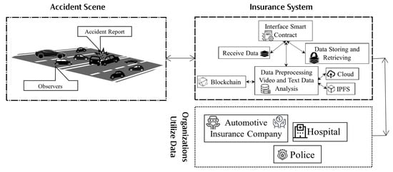 In this section, we present previous studies from the pertinent literature that investigated the problems and challenges related to cloud computing and blockchain in the auto-insurance industry and proposed solutions accordingly. Auto-insurance systems are being automated to avoid fraud and delays in insurance claims. In this regard, some insurance companies are storing data (videos related to accidents and information about policyholders) on the cloud and conducting insurance transactions through the blockchain network, as shown in Figure 2. The insurance system in Figure 2 can collect traffic-event-relevant data from the vehicles, user devices, etc.; store or retrieve the data on various types of storage systems, including IPFS and cloud; analyze the video data; and provide the data or analysis results to other organizations when they are requested. Each block in the insurance system can be implemented as an application running on a node with computing capabilities or as a smart contract in the blockchain.