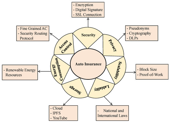 Security refers to protection against anything that can harm the system. In the cloud and blockchain contexts, various types of malicious attacks are possible. The security of insurance data needs to be further enhanced and standardized as some of the nodes can be compromised, which can interfere with the data [57]. Therefore, it is necessary to employ security in both blockchain and cloud computing to prevent the unauthorized access to and disclosure, copying, or editing of insurance data. The security and privacy of consumers’ records is crucial in auto-insurance and requires a number of standards to be maintained. Some of the most common security and privacy concerns for vehicle insurance and the relevant data are presented below.