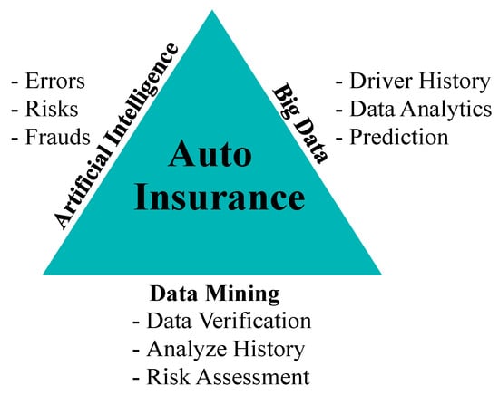 - AI, big data, and data-mining techniques can be applied to auto-insurance to handle the various associated challenges, as illustrated in Figure 4. These can be used to monitor user activity in the auto-insurance sector and to keep track of stored data. Auto-insurance companies can benefit from AI by reducing process errors, predicting risks, and identifying fraud [26]. Because of this, the insurance provider will be better able to recommend insurance to customers based on their needs. Consumers can also benefit from enhanced AI-based claims processing. Auto-insurance companies can exploit big data in a variety of ways. For example, telematics provides insurers with the ability to collect information about driver usage and behavior to offer usage-based insurance and premium discounts. Auto-insurance firms can be protected from many types of fraud using big data [27]. For example, prediction models can be used to compare an individual’s information to previous fraudulent profiles, facilitating further investigation. ML approaches enable insurers to verify the captured data and conduct more accurate risk assessments by analyzing the potential client’s past behavior and the behavior of other clients with similar demographic characteristics.