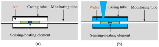 The temperature tracing method is based on the theory of heat conduction and identifies the crack according to the difference in the cooling rate of the heat source between the crack and the surrounding medium. The schematic diagram of the temperature tracing method is shown in Figure 1. Chen et al. [47] measured the underwater concrete cracks according to the change of heat source cooling rate caused by the change of water content in the porous casing before and after the crack, but this method was less sensitive and could not measure the crack width. Zhu et al. [48] proposed a temperature tracing method and monitoring system for the detection of underwater concrete cracks in dams based on the theory of heat conduction. Zhang et al. [49] amplified the difference in the cooling rate of the heat source before and after crack emergence by using a hollow sleeve, and measured the crack width using an improved monitoring system. However, these methods require a large number of detection pipes to be pre-embedded in the underwater concrete structure, which will have some impact on the performance of the dam during its normal use.