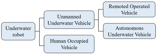 As the main tool for humans to explore the deep-sea environment, underwater robots have always been valued by various countries. In recent years, they have played an important role in the development of marine resources and deep-sea exploration [54]. At present, according to the operating space, control mode, and power characteristics, underwater robots can be divided into human-occupied vehicles (HOV) and unmanned underwater vehicles (UUV). In recent years, HOVs and UUVs have played an increasingly important role with the demands of deep and distant ocean surveys. Unmanned submersibles can be further divided into cable remote-operated underwater vehicles (ROV) and autonomous underwater vehicles (AUV) [35]. The classification of underwater robots is shown in Figure 3.