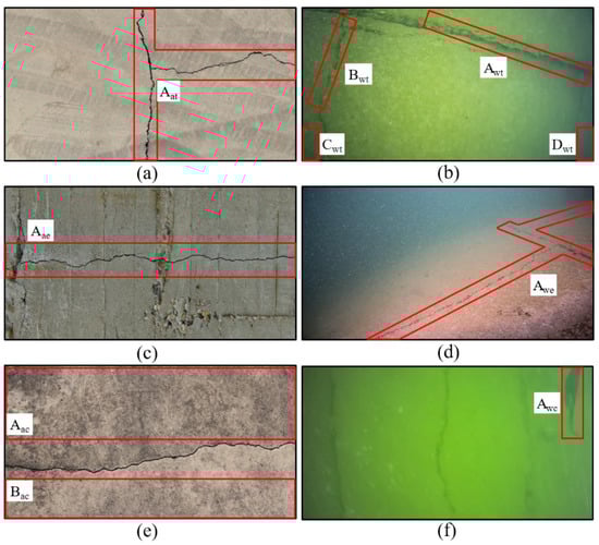Comparison of above-water and underwater crack images on the dam surface: (a) the above-water crack image; (b) the under-water crack image; (c) the above-water crack image; (d) the under-water crack image; (e) the above-water crack image; (f) the under-water crack image.