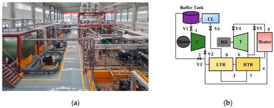 IET has built a 1 MWe sCO2 experimental power plant of the simple recuperated closed Brayton cycle [27]. The layout of the system is shown in Figure 1. The system mainly includes the compressor (C), turbine (T), low-temperature recuperator (LTR), high-temperature recuperator (HTR), cooler (CL), heater, hydraulic dynamometer (HD), and other auxiliary systems (dry gas seal system, control system, gearbox oil station, cooling system, charging system, lubricating oil station, etc.). V1 represents the compressor inlet regulating valve, V2 represents the compressor outlet regulating valve, V3 represents the compressor bypass valve, V4 represents the turbine inlet regulating valve, and V5 represents the turbine bypass regulating valve. The designed system performance parameters are shown in Table 2; the parameters of each component are shown in Table 3. The self-developed sCO2 two-stage centrifugal compressor has completed the full-load test under various inlet conditions and has reached the design speed [28]. In the minor cycle of the buffer tank, CO2 is pressurized by the pneumatic circulating pump and electric booster pump, heated to the supercritical state by the electric heater, and stored in the buffer tank. Then, sCO2 enters the LTR and HTR for heat regeneration after being boosted by the compressor. The external heat source is a gas-fired sCO2 heater. The working medium enters the heater for heat absorption and then enters the turbine for expansion. The expansion work is consumed and measured by the hydraulic dynamometer. After being recuperated by the HTR and LTR, the exhaust sCO2 enters the cooler for heat rejection. Finally, it returns to the buffer tank to complete the closed cycle.