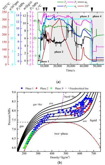 Recently, our team conducted the low-parameter commissioning of the experimental system. The purpose of the experiment is to test the performance of the combined operation and continuous startup of the compressor and heater when the compressor operates at low speed, the heater operates at low load, and the system is in a low-pressure state. The parameters of the measurement sensor for the pressure, temperature, and mass flow rate are shown in Table 4. According to the startup mode of the compressor and heater, the test process can be divided into four phases, as shown in Figure 2a and Table 5. P1 and T1 represent the compressor inlet pressure and temperature, respectively; P2 represents the outlet pressure; m1 represents the compressor flow rate; nc represents the compressor speed; and TIT represents the heater outlet temperature. The time points of sCO2 venting are shown by the black arrow at the top of Figure 2.
