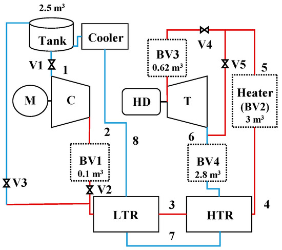 In this work, we use MATLAB programming coupled with the NIST-REFPROP physical property database to build a dynamic simulation model for the sCO2 closed Brayton cycle. The models of the heat exchanger, compressor, turbine, valve, and buffer tank are based on the vendor data, and the connection relationship is based on the interactive characteristics of these components. The reliability of the model is validated by comparing it with experimental data for each component. Figure 3 depicts the system model, in which the system’s connecting pipeline is considered as several buffer volumes on the flow path, and the red line in the figure indicates the high-pressure section and the blue line indicates the low-pressure section. Furthermore, we apply the assumptions for the control volume that its interior conditions are equal to the outlet condition.