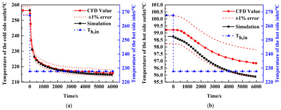 After establishing the dynamic model of the heat exchanger, 40 nodes are selected for the HTR and LTR, respectively, and 80 nodes are selected for the CL to capture the nonlinear physical property with sufficient resolution, comprehensively considering the computing time and accuracy. Subsequently, by specifying the same working conditions, we compare our steady-state simulation results with the experimental and simulation data of the recuperator from Clementoni [33], Carstens [34], and Hu [9]. As shown in Table 6, the outlet temperature is used to verify the dynamic model, and the errors are less than two percent, within the allowable range. Furthermore, the dynamic simulation model is verified using the CFD calculation results of Ma’s laminated semicircular channel PCHE [35]. The geometric parameters and inlet conditions in the literature are used as the input values of the dynamic model of the recuperator. According to the Hesselgreaves [36] heat-transfer correlation for a semicircular channel in the entrance region, the temperature response after the hot-side inlet temperature steps down by 40 °C is compared with literature data. Figure 5 depicts the changing trend of outlet temperatures on the hot and cold sides. Both hot- and cold-side simulation data keep within the ±1% error range. It can be seen that the simulation value of the cold-side outlet agrees well with the literature data, and the dynamic change of the hot-side outlet temperature is consistent with the trend of the literature data. The error of the hot-side outlet temperature mainly comes from the 0.5 °C error of the initial value. Therefore, the steady and dynamic performance of the model of the recuperator and cooler in this work are validated in terms of accuracy and reliability. Hence, based on the heat-exchanger model, the HTR, LTR, and CL of the experimental system are modeled to obtain their steady-state temperature distribution under the designed conditions, as shown in Figure 6.
