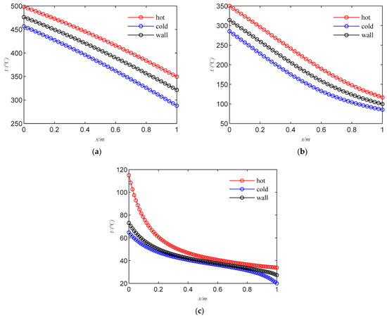 Steady-state temperature profile inside the heat exchanger under the designed conditions: (a) HTR (nearly linear distribution); (b) LTR (nonlinear distribution); (c) CL (strong nonlinear distribution).