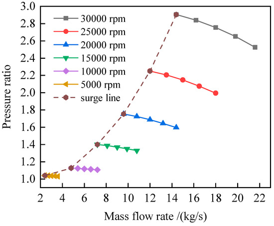 The flow coefficient and head coefficient are commonly used to model compressor performance. For a sCO2 compressor, the ideal isentropic enthalpy rise and efficiency under different working conditions are determined by varied inlet conditions, inlet flow rates, and rotating speeds. Dyreby [38] found that, in the traditional method, the flow coefficient and the head coefficient are used to nondimensionalize the ideal enthalpy rise and efficiency of the compressor at different speeds and flows without considering the influence of the inlet state deviating from the design condition and having many independent variables, so he developed a new empirical correlation between the flow coefficient and head coefficient and obtained the relationship between the modified head coefficient and the modified flow coefficient with a fourth-order polynomial. The performance chart data were derived from Barber Nichols, and the method is verified by compressor test data under distinct inlet conditions provided by SNL. He believed that the flow through a low-reaction turbine was mainly affected by the inlet conditions, outlet pressure, blade shape, and nozzle design and was less affected by the rotating speed. Therefore, the flow through the turbine was predicted by the fluid inlet density, effective nozzle area, and spouting velocity, and the velocity ratio and efficiency relationship were fitted by a fourth-order polynomial. In this work, we adopt the modeling method of compressors under variable working conditions established by Dyreby. The data come from the experimental test and numerical simulation of the compressor [28], and the compressor model is assumed to be adiabatic and the kinetic energy effect is ignored. The performance map under the designed inlet condition of the compressor is shown in Figure 7. Therefore, the following correction formula is obtained: