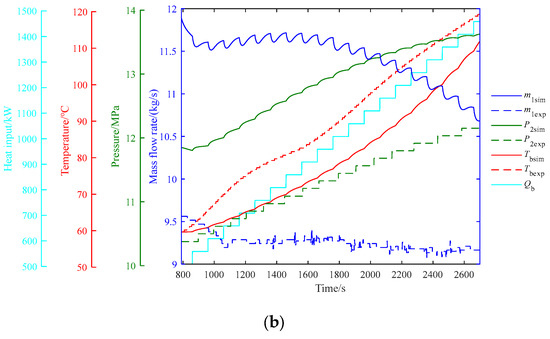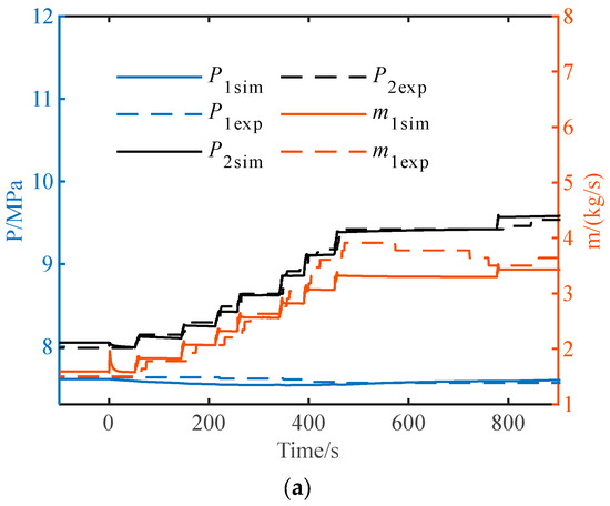 After the benchmarking of the sub-model, the overall system model has been verified with the experimental transient results. The test data in Figure 2 will not be able to be employed for validation because, on the one hand, the inlet falls into the subcritical zone and enters the two-phase zone, and the physical property function is unable to accurately calculate the relevant physical property; on the other hand, there are multiple venting operations, and the amount of venting cannot be adequately estimated. Hence, the system dynamic model is verified based on the results of the other two experimental tests: the test of increased compressor speed and the test of increased heating power, as shown in Figure 8.