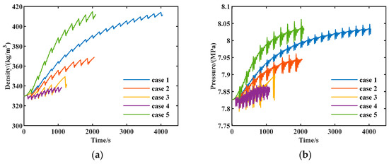 At this stage, the effects of different variations of the compressor speed and heating rates on the density and pressure of the buffer tank are compared. The parameters of different cases are shown in Table 8, and the results are shown in Figure 9. Due to the consideration of compressor safety and the limitation of dry gas sealing performance, the maximum speed of the compressor during startup is 20,000 rpm (less than the rated speed of 30,000 rpm), so the speed increase is 10,000 rpm. After the compressor speed reaches 20,000 rpm, the simulations stop. The temperature of the buffer tank throughout the whole process is maintained at 35 °C under the PID control of the cooling water. Case 1 has the smallest speed change variation, while Case 3 has the highest; Case 4 has the smallest speed increase interval, and Case 5 has the largest heating rate. It can be seen from the results that, under the same heating rate, with the increase of the speed-up variation and the decrease of the speed-up time interval, the overall change in the buffer tank’s density and pressure decrease, but the local disturbances of density and pressure both increase, which is not in favor of a smooth startup at the initial stage. Moreover, under the same speed-up change, a high heating rate causes more significant changes in the buffer tank’s density and pressure than a low heating rate does, which is consistent with the experimental result. In addition, it can be seen from Cases 1 and 5 that when the speed-up change is too small or the heating rate is too high, the heater and compressor do not match to a certain extent, resulting in a rapid increase in density and pressure, which is not beneficial to the stability of the system.