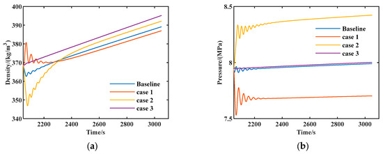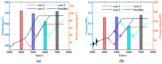 The baseline condition is one in which there is no venting in the entire process. The venting time in Case 2 is the same as that in Case 1, and the temperature continues to rise after the venting. The density change in Case 2 is 98 kg/m3, which is less than 106 kg/m3 in Case 1, while the pressure change in Case 2 is 172 kPa, which is greater than 168 kPa in Case 1. Compared with Cases 1, 2, and baseline, as the system continues to rise in temperature after the same venting time under various venting conditions, a small pressure change in the tank causes a greater density change. This is because the CO2 in the buffer tank is in the region near the pseudocritical line of the pressure–density diagram at the end of venting, such as in Figure 3. Cich [24] found that the loop required mass can vary by three times when loop filling from 6.9 MPa to 8.3 MPa with a constant temperature, which agrees with the above simulation conclusion. The venting time of Case 3 is twice as long as that of Cases 1 and 2. At the same time, the density of the venting condition in Case 3 is the highest, and the density in the buffer tank in Case 3 is close to that of Case 2 at the end of the venting. However, as the temperature continues to rise, the density and pressure changes in Case 3 are 77 kg/m3 and 123 kPa, respectively, which are significantly less than those of Case 1 and Case 2. This is due to the fact that Case 3 has the largest venting mass and the smallest system circulation flow; additionally, the same amount of heat from the heater is absorbed with a small flow, and the whole system is heat-soaked to promote further heat transfer from the recuperator. Cich [24] also recommended maintaining a constant small flow when the combustion temperature of the heater rose in the Sunshot experiment. Therefore, the overall system was heat-soaked, especially the recuperator and pipes. However, if a large flow rate was maintained, too much heat would be taken away.