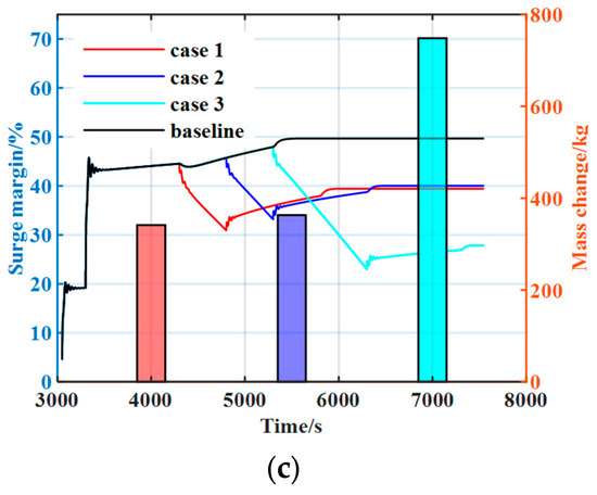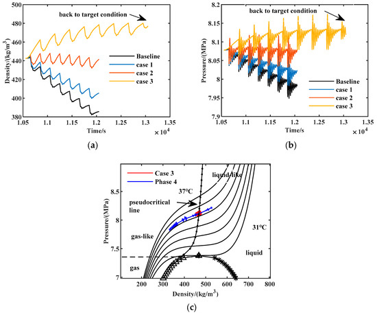 To summarize, Case 3 should be chosen to stabilize the buffer tank’s parameter changes because venting in the high-density region lasts relatively long to promote the heat utilization of the system and is relatively far away from the pseudocritical region, as opposed to Cases 1 and 2. At the same time, as shown in Figure 11c, Case 3 is also limited by the reduction of the surge margin. The surge margin of Cases 1 and 2 is reduced to nearly 30% at the end of the venting, while the surge margin of Case 3 is close to 20%, which means that the increase in venting is at the expense of the surge margin. In addition, the component-interacted relationship of a closed cycle and the special thermal properties of a near-critical work zone cause oscillatory behavior for the pressure in the buffer tank at the start of venting or at the beginning of a continued temperature rise.
