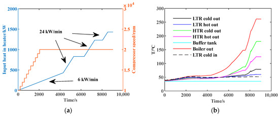 - Phase 1: The speed of the compressor and the heating power are increased at the same time, and the applicability of this method in the initial stage is tested. The speed range of the compressor is between 10,000 rpm and 20,000 rpm. While the heat input of the heater is increased with a variety of linear ramp rates, the compressor speed is elevated with a step variation at different intervals over time.
