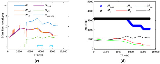 - By simulating the system’s transition from a cold state to the desired operating condition with the TIT of 250 °C and the compressor speed of 20,000 rpm, the transition stage within the practical constraints of the components is completed smoothly, and 60% of the rated mass flow rate and 67% of the rated compressor speed are reached at last. The system has experienced two venting operations: the first helps the system build up heat regeneration, while the second reduces the temperature gradient and improves the temperature uniformity, and the system’s final mass under target conditions is 2065 kg. Additionally, the buffer tank’s temperature variation significantly affects the tank’s pressure change, but it has less impact on the density changes. Therefore, temperature control is one of the key measures to avoid the occurrence of overpressure in the buffer tank during startup.
