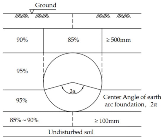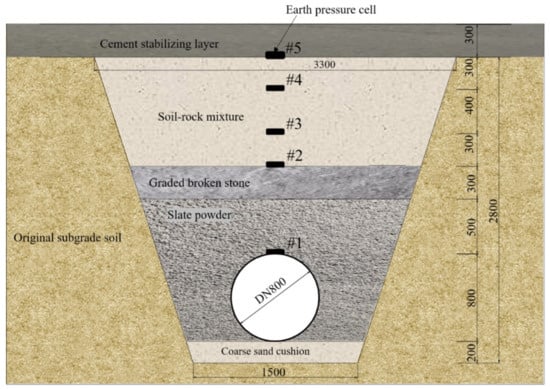 A trapezoidal ditch was excavated for pipeline burial in the original subgrade with a slope of 1:0.33. The compactness of backfill soil followed regulatory standards [], as shown in Figure 1. The circumference of the pipe was filled with stone chips and stone powder, and 50 cm of stone powder was used as fill above the pipe, followed by graded gravel and soil-rock mixture. The thickness of each layer was 30 to 40 cm after compaction. The design elevation of the pavement was 46.02 m, the design elevation of the pipe bottom was 42.71 m, and the buried depth of the pipe was 3.31 m, as shown in Figure 2.