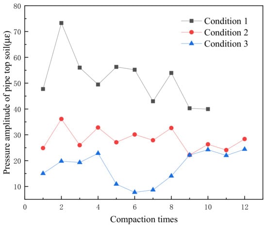 The variation of dynamic earth pressure amplitude at the pipe top at various compaction times is shown in Figure 4. The figure shows that with increasing filling depth, the amplitude of earth pressure on the pipe roof decreased, indicating that the influence of dynamic load on the pipeline decreases with an increase in the buried depth of the pipeline. After the ninth compaction, the soil pressure on the pipe roof in Condition 3 was close to that in Condition 2, and the increase of the buried depth of the pipeline had little contribution to the decrease of the top pressure of the pipeline. Therefore, a 1.8 m burial depth can be taken as the optimal depth for the project.