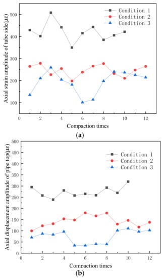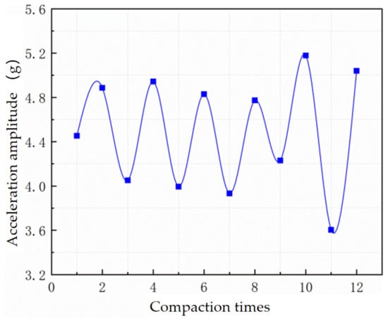 The amplitude of dynamic earth pressure on the pipe top is affected by compaction times. Meanwhile, the vertical acceleration of the vibratory roller in Condition 2 presented the same trend as the pressure on the pipe top, and its amplitude fluctuated with the compaction times, as shown in Figure 5. At the first compaction, the filling material was relatively loose, and the vibration energy of the vibratory roller was mainly dissipated in the form of plastic deformation energy storage of the filling material. At the second compaction, the filling material became dense, and the plastic energy storage was reduced, so the acceleration amplitude showed a rebound phenomenon. However, at the third compaction, the soil was over-compacted, and the filling material was re-compacted to absorb energy, so the acceleration amplitude decreased. The same trend between acceleration and pipe top pressure indicates that the pipe top pressure increases with the increase of backfill compaction degree. It is noted that at the ninth compaction, the vibration acceleration amplitude reached the maximum value of 5.178 g, indicating that the filling material had reached another better compaction state. The minimum vibration acceleration amplitude measured at the tenth compaction also confirmed this. Due to the large distance between the pipe top and the ground, in Condition 3, the pipe top soil pressure showed the same change trend between several compactions and was not as sensitive to the compaction times as the other two conditions. The maximum and minimum values of the pipe top pressure amplitude in Condition 1 were 34.56 kPa, which was much larger than that in Condition 2 and Condition 3. This indicates that when the pipe is shallowly buried, the pipe top pressure is significantly affected by the compaction degree. The maximum and minimum values of the amplitude of the pipe top pressure in Condition 1 differed by 34.56 kPa, which was much larger than that in Condition 2 and Condition 3. This indicates that when the pipeline is shallowly buried, the pipe top pressure is significantly affected by the compaction.