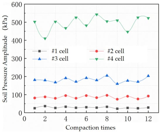 Figure 6 shows the amplitude values of soil pressure at different burial depths under Condition 2. It can be seen from the figure that the variation trend of the amplitude value of the #4 soil pressure cell closest to the ground is opposite to that of the other three soil pressure boxes, which is due to the fact that the surface filling soil is compacted before the bottom filling material.