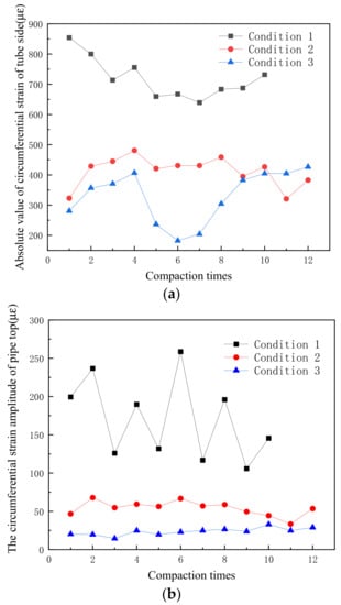 - The strain at the top of the pipe is mainly axial strain, while at the side of the pipe, circumferential strain is greater than axial strain. In addition, the strain values at the side of the pipe are all greater than those at the top of the pipe. The axial strain at the pipe top is greatly affected by the adjacent parts, so the trend of its change is different from the pipe pressure with the increase of compaction times.
