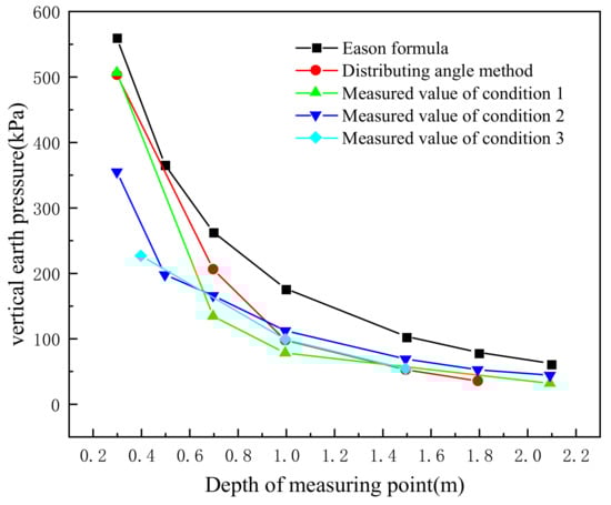 The earth pressure values obtained from the G Eason formula, the distribution angle method, and the field test during the ninth compaction are provided in Figure 9. It is observed from the figure that the variation law of the dynamic earth pressure amplitude in the subgrade with the depth calculated using the G Eason formula and the distribution angle method are consistent with the measured values. When the depth of the measuring point is less than 0.6 m, the dynamic earth pressure amplitude calculated by the G Eason formula is closer to the field measured value. In addition, it can be seen that the dynamic earth pressure amplitude at each depth measurement point calculated by the distribution angle method (when the buried depth is greater than 0.7 m) is the closest to the measured value. However, in the subgrade surface area, the distribution angle method underestimates the magnitude of the dynamic earth pressure produced by the vibratory roller. Therefore, in engineering, the G Eason formula can be used to predict the dynamic earth pressure amplitude above the pipe when the depth of the measuring point is less than 0.6 m. When the depth of the measuring point is greater than 0.7 m, the distribution angle method should be used to predict the dynamic earth pressure amplitude.