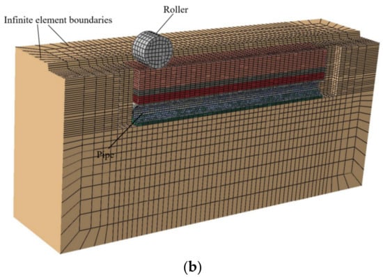 At present, there are few reports about the dynamic response of buried pipelines under the action of a large vibratory roller. Abolmaali et al. [] studied the stress-strain characteristics of cement pipelines under the action of a vibratory roller, predicted the initiation and propagation of cracks, and studied the influence of the compaction degree of pipe-side soil on pipeline deformation. However, in this paper, compaction forces were applied only at four specific locations without considering the impact of roller speed. Alzabeebee et al. [] studied the behavior of buried pipes under static and moving traffic loads using a robust finite element analysis. The results show that the maximum pipe crown displacement is greatly affected by the load velocity, and the increasing load speed causes a small decrease in the induced pipe displacement. Therefore, if the load movement is not considered, the results are conservative and inconsistent with the actual situation. In addition, Abolmaali’s research did not involve flexible pipes.