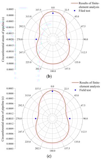 The circumferential strain of pipeline obtained by finite-element analysis and field tests: (a) Condition 1, (b) Condition 2, and (c) Condition 3.