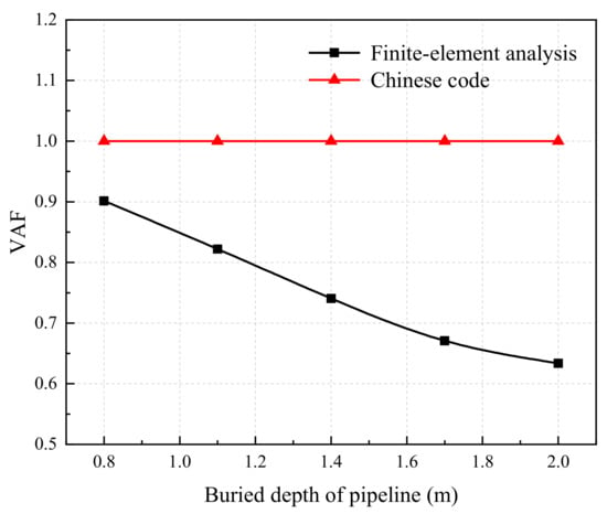 Figure 12 provides the VAF calculated using the Chinese code method [] and the finite-element analysis at the pipe top under soil pressure. The values of soil pressure on the pipe roof obtained by finite-element analysis and the Chinese code method are shown in Figure 13. It is observed from the figures that the VAF under each buried depth calculated by the finite-element model is less than 1, indicating that the soil arch effect occurs during backfill application during pipeline construction. In addition, with increasing buried depth, the VAF shows a decreasing trend, and the soil arch effect at the top of the pipeline is more obvious. The Chinese code [] did not consider the influence of soil arching effect on the soil pressure on the pipe top, so the formula solution of the code was quite different from the finite-element analysis, and the difference between them further increased with the increase of the buried depth of the pipe. When the buried depth reached 2.0 m, the calculated value of the standard formula was 1.58 times the finite element calculation value.