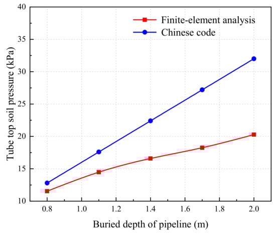 - Under earth pressure, with the increase of buried depth, the soil arching effect at the top of the pipeline becomes more obvious. The calculation results of soil pressure at the top of the pipeline obtained by Chinese specification are quite different from the finite element results, and with an increasing buried depth of the pipeline, the difference between them increases.