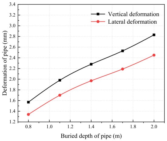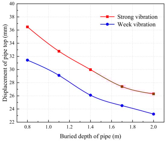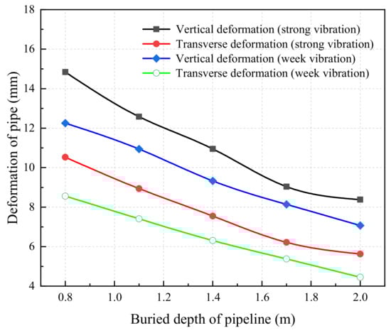 Figure 14 and Figure 15 show the deformation of the pipeline and the displacement of the pipe top under strong and weak vibrations (vibration frequencies of loads are 28 Hz and 33 Hz, respectively). Figure 16 and Figure 17 represent the deformation and displacement of the pipeline under earth pressure. It can be seen from these four figures that, under the earth pressure, the deeper the pipeline is buried, the greater the deformation of the pipeline and the displacement of the pipe top. The vertical deformation of the pipeline increased more rapidly than the horizontal deformation. When the buried depth increased from 0.8 m to 2 m, the lateral deformation increased by 1.02 mm, which was less than the 1.3 mm increase in vertical deformation. During backfilling, the compaction degree of the soil on the sides of the pipeline was higher than that on the top of the pipeline, which made the pipe less likely to deform to both sides. With increasing burial depth, the pipeline experiences horizontal deformation, which tends to compact the soil on the side of the pipeline. At the same time, the pressure from the top-filling soil will further compress the soil on the side of the pipeline. The compaction degree of the bottom-filling soil will also increase with the increasing pressure from the top-filling soil. Therefore, the increased rate of pipe top displacement decreases with the increase of buried depth.
