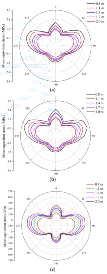 Figure 18 shows the Mises equivalent stress distribution of the pipe ring section under strong and weak vibration states, both of which are “butterfly-shaped” and symmetrical about the vertical direction. With the increase of burial depth, the equivalent stress of the ring section increases gradually, and the equivalent stress of the sidewall of the pipeline increases most obviously, followed by the top of the pipe and the slowest increase at the bottom of the pipe. Under the two vibration states, the maximum equivalent stress of the pipe ring section appears on both sides of the pipe, namely at 75° and 285°, which is similar to distribution under static force. Under the weak vibration state, the equivalent stress of the ring section at the top of the pipe is approximately the same as at the bottom of the pipe. While under the strong vibration state, the equivalent stress of the pipe top is significantly larger than the bottom.
