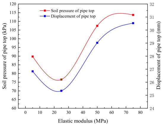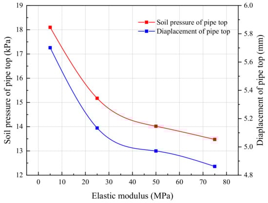 The displacement and soil pressure at the top of the pipeline change with the elastic modulus of backfill soil under the earth pressure, as shown in Figure 19. It can be seen that the displacement and earth pressure of the pipe top shows a downward trend with an increasing elastic modulus of the backfill soil. When the elastic modulus increases to 5 times the initial value, the displacement and the earth pressure of the pipe top decrease by about 10.0 and 15.3%, respectively. However, with a further increase in elastic modulus, the decreasing trend gradually diminishes. When the elastic modulus increases to 15 times the initial value, the pipe top displacement and the pipe top earth pressure decrease by 16.2 and 23.5%, respectively. According to the definition of soil arching rate, the increase of elastic modulus of the filling material causes the soil arching rate to decrease, demonstrating that the elastic modulus of the filling has a significant influence on the soil arching effect and that there is a positive correlation between them. The possible reason is that when the elastic modulus of backfill soil is large, its own resistance to deformation is strong, and the integrity is strong, so it can reduce the stress deformation of the pipeline under static force to a certain extent.