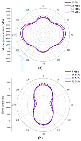 Figure 20 shows the Mises equivalent stress and circumferential strain of the pipeline when backfilled with different properties. From Figure 20a, it can be seen that with the increase of elastic modulus of backfill, the equivalent stress on the middle ring section of the pipeline decreases gradually. Additionally, the maximum equivalent stress occurs at the centerline of the sidewall of the pipeline, and the equivalent stress at other positions does not decrease significantly with an increase in the elastic modulus of the fill. It can also be observed from Figure 20b that the variation law of circumferential strain is similar to that of equivalent stress, but the position where the maximum value of circumferential strain appears is slightly lower than that of equivalent stress. In summary, under the earth pressure, the increase of elastic modulus of backfill soil makes the soil arching effect more apparent, and more of the pipe top load is borne by the soil to the side of the pipe, which is also the reason for the decrease of pipe stress and strain. Therefore, the increase of elastic modulus of fill is conducive to the protection of pipelines.