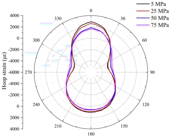The axial and circumferential strain amplitudes along the pipe side and over the top are shown in Figure 7 and Figure 8. It can be seen from the figure that the strain at the top of the pipe is mainly axial strain, while at the side of the pipe, circumferential strain is greater than axial strain. In addition, the strain values at the side of the pipe are all greater than those at the top of the pipe. This results from the vertical compression of the pipeline under the action of vertical pressure and the relative displacement occurring between the soil above the pipeline and the soil at the pipeline side, which causes the soil arching effect. Therefore, part of the pressure above the pipeline was borne by the soil along the pipe side, the soil pressure thus increased, and the circumferential strain value at the pipeline side was greater than that of other parts. The strain above the pipe top was mainly axial. At the same time, the vertical compression deformation of the pipeline caused the pipeline to expand laterally, and the soil on the side of the pipe restricted this deformation, thus exerting a great force on the pipe. Therefore, the strain on the side of the pipe was greater than that of other parts.