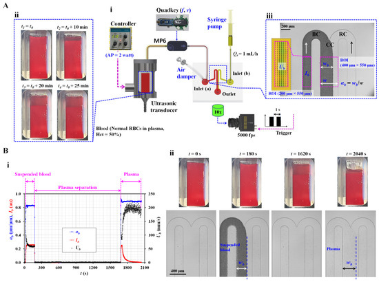 Proposed method for separating plasma and sequentially measuring individual viscosities of blood and plasma. (A) Experimental setup, plasma separation, and quantification of blood. (i) Schematic of the experimental setup, including, a microfluidic device, an ultrasonic transducer, two pumps (i.e., micro pump and syringe pump), and an image acquisition system. (ii) Plasma separation from the suspended blood with an elapse of time (i.e., t1 = t0, t2 = t0 + 10 min, t3 = t0 + 10 min, and t4 = t0 + 10 min). (iii) Quantification of blood velocity (Ub) and interface (αb). (B) Quantification of three parameters (i.e., interface, image intensity, and blood velocity) for suspended blood (i.e., normal RBCs suspended in plasma, and Hct = 50%). (i) Temporal variations of αb, Ib, and Ub. First, the suspended blood was supplied for 3 min. Next, plasma was separated from the blood for 25 min; plasma was then supplied for 6 min. (ii) Snapshots of the ultrasonic chamber and microscopic images with respect to time (t) (t = 0, 180, 1620, and 2040 s).