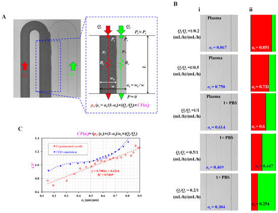 Here, the test fluid and reference fluid were selected as the plasma and 1 × PBS, respectively. To simulate variations in αt by means of a CFD Solver (CFD-ACE+, ESI Group, Paris, France), the viscosity ratio of the two fluids was given as µt/µr = 1.674. As shown in Figure 2(B-i), microscopic images representing αt were summarized with respect to Qr/Qt = 1/0.2, 1/0.5, 1/1, 0.5/1, and 0.2/1. Additionally, based on the numerical simulation results, as shown in Figure 2(B-ii), the variations in αt were clearly visualized with a binary color representation with respect to Qt/Qr. Consequently, αt showed a tendency to increase at higher value of Qt/Qr. Both the methods provide consistent variations in αt with respect to Qr/Qt. To obtain the variations in CF with respect to αt, the analytical formula of the correction factor was derived as