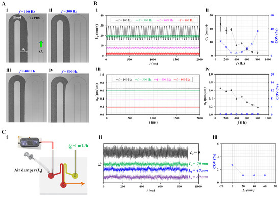 Quantitative evaluation of blood flow delivered by micro pump and blood flow stabilization with air damper. (A) Microscopic images showing variations of interface with respect to operational frequency (f) ([i] f = 100 Hz, [ii] f = 300 Hz, [iii] f = 400 Hz, and [iv] f = 800 Hz). (B) Contributions of operational frequency to blood velocity and interface. (i) Temporal variations of Ub with respect to f. (ii) Variations of Ub and COV with respect to f. (iii) Temporal variations of αb with respect to f. (iv) Variations of αb and COV with respect to f. (C) Contribution of air damper to blood flow stabilization. (i) Schematic diagram showing air damper connected to a microfluidic device. (ii) Temporal variations of Ub with respect to Lt = 0, 20, 40, and 60 mm. (iii) Variations of CV with respect to Lt.