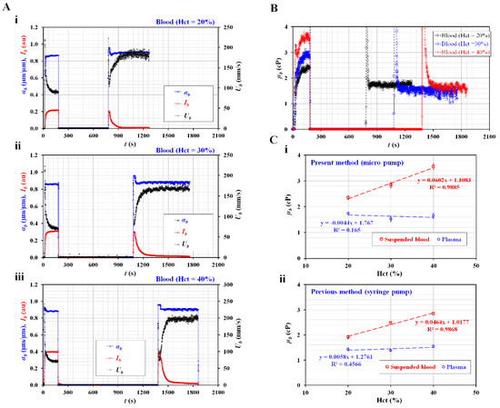 Sequential viscosity measurement of suspended blood and plasma with respect to Hct. (A) Temporal variations of αb, Ib, and Ub with respect to Hct = 20%, 30%, and 40%. (B) Temporal variations of µb with respect to Hct. (C) Quantitative comparison between the present method (i.e., blood delivery with micro pump) and previous method (i.e., blood delivery with syringe pump). (i) Steady viscosity value of blood and plasma obtained using the present method with respect to Hct. (ii) Viscosity value of blood and plasma obtained by previous method with respect to Hct.