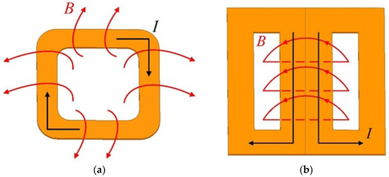 Since there is compensation inductance L1 on the transmitter side, it will generate unnecessary coupling interference with Lp and Ls, which complicates the design and affects the efficiency of system energy transmission. Therefore, this article considers the decoupling design of the series compensation inductor L1 and LCT. According to [27], unipolar coils and bipolar coils placed in parallel have no coupled mutual inductance in case of alignment. Figure 4 shows the magnetic field distribution diagrams generated by unipolar and bipolar coils. B and I in the figure represent the magnetic field and current of the coils respectively. Generally, unipolar coils generate a magnetic field away from the center of the magnetic field, while bipolar coils produce a magnetic field distributed along the axis (long axis or width axis). When the unipolar coil and the bipolar coil are coaxially placed in parallel, since the magnetic flux generated by the bipolar coil is symmetrical along the space, the magnetic flux flowing into the unipolar coil is equal to the magnetic flux flowing out of the bipolar coil. Therefore, the unipolar coil and the bipolar coil are decoupled from each other, i.e., there is no coupled mutual inductance between them. This decoupling design can maximize the space utilization of the magnetic coupling coil, reduce the size of the IPT system, and ensure that the transmitting coil Lp transmits power only to the receiving coil Ls, improving the transmission efficiency and stability of the system.