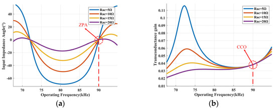 Obviously, according to Formula (11), the input impedance Zin is related only to Rac, so the system input impedance is purely resistive, and ZPA input can be achieved under different loads. According to Formula (12), the transconductance gain G is independent of Rac. Therefore, the proposed system can achieve CCO functions.