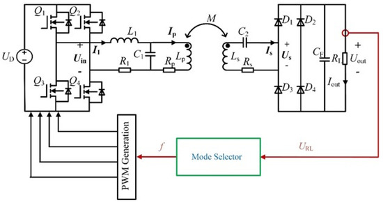 Figure 2 shows the circuit structure diagram of the proposed LC/S compensated IPT system. Lp and Ls represent the self-inductance of the transmitting and receiving coils, and L1 is the compensation inductance. R1, Rp, and Rs represent the parasitic resistance of the compensation inductance and coils. Since the values of R1, Rp, and Rs are very small, they can be ignored in the analysis in the interest of simplification. M represents the mutual inductance between the transmitting and receiving coils. The transmitting side of the system includes a constant DC power supply Ud, a high-frequency inverter (HFI) consisting of four MOSFETs (Q1–Q4), a series compensation inductor L1, a parallel compensation capacitor C1, and a transmission coil Lp; the receiving side includes a receiving coil Ls, a series compensation capacitor C2, and a rectifier connected in parallel with a filter capacitor CF. The full-bridge rectifier provides DC power for the battery load RL. Figure 3 shows a simplified circuit diagram of the topology, in which the square wave voltage Uin driven by the HFI and the value of the equivalent load Rac can be expressed as: