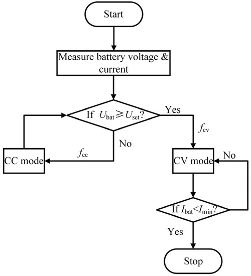 As was confirmed in the previous section, the proposed LC/S compensated IPT system can achieve CCO and CVO characteristics at two distinct ZPA operating frequencies through appropriate parameter design, without the need for redundant AC switches (ACS). Figure 9 shows the switching strategy for the system charging mode. Figure 10 depicts the mode-switching part in the green box in Figure 9. More specifically, when the IPT system starts to work, the charging voltage Ubat and current Ibat of the battery are synchronously measured by the voltage and current sensors, and the values are sent to the controller. Uset is the charging voltage specified in CV mode, namely, the critical voltage at the transition point (Uset = 45 V) between CC mode and CV mode. When Ubat < Uset, the controller charges in CC mode at the CC frequency fcc. As the voltage continues to rise until Ubat ≥ Uset, the controller charges in CV mode at the CV frequency fcv. As the charging current decreases, the IPT system stops working when the charging current Ibat < Imin is detected. Imin is the specified minimum charging current (Imin = 0.25 A).
