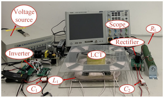 To verify the above theory, a confirmatory experimental prototype of the proposed system was constructed. The hardware of the prototype is shown in Figure 11. It consists of a DC voltage source, a compensation inductor L1, compensation capacitors C1 and C2, an LCT, an HFI, a rectifier, a resistive load, and an oscilloscope. Referring to the LCT structural parameters in Table 2, the coil used for the experiment is wound, as illustrated in Figure 12. As shown in Figure 12, the transmitting coil Lp is placed just above the series compensation inductor L1, ensuring the compactness of the whole IPT system. In addition, the coupling mutual inductances between Lp and L1 and between Ls and L1 are both zero as measured by the LCR meter, which verifies the theoretical analysis of the decoupling coil in Section 3. The measured values for each piece of hardware are shown in Table 4.