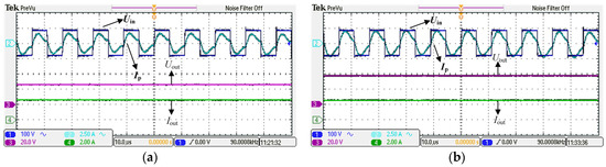 Experimental waveforms of the IPT system in CC charging mode. (a) RL = 10 Ω; (b) RL = 15 Ω.
