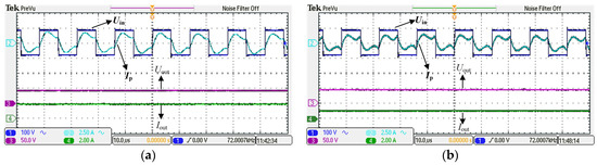 Experimental waveforms of the IPT system in CV charging mode. (a) RL = 25 Ω; (b) RL = 50 Ω.