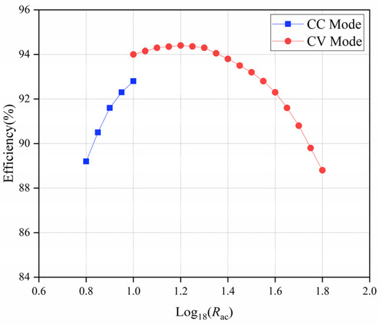 The energy transmission efficiency curve of the system during the whole charging process is displayed in Figure 15. In CC charging mode, the energy transfer efficiency of the system increases rapidly from 89.2% to 92.8%. When the equivalent load rises to 18 Ω, the operating frequency of the system is switched from ωcc to ωcv for CV charging mode. In CV charging mode, the peak energy transfer efficiency of the system is 94.4%. In addition, the power transfer efficiency of the system stays at a relatively high level throughout the charging process, which ensures high efficiency of the proposed LC/S compensated IPT system.