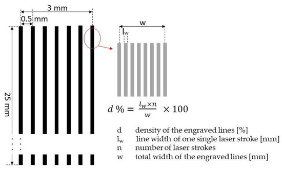 Overview of laser engraving area and lines for Al samples including the corresponding parameters regarding the density of engraved lines.
