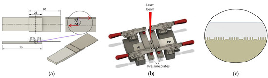 For the joining process, a TruFiber 400 equipped with Scanlab HS20 2D f-ϴ scanner head is used. Figure 2 shows the details of the overlap configuration between Al and PP before the joining process, in addition to the modeled interlocking. An overlap of 25 mm was selected, following ASTM D5868-01 (2014) [23]. The clamping force was kept constant for all samples, and the focal point of the laser beam was fixed on the surface of Al samples.