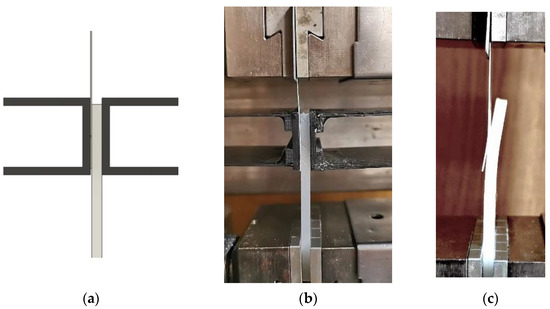 Evaluation of the mechanical performance of the joints was implemented by a tensile-shear test with a fixture to avoid the bending of the samples due to the offset (see Figure 2a) between the PP and Al. This fixture was made of a low-friction carbon fiber composite and only applies a pure tensile shear force on the sample. The tests were all executed at an equal speed of 2 mm/min. Figure 4 shows the tensile-shear tests with and without the designed clamp.